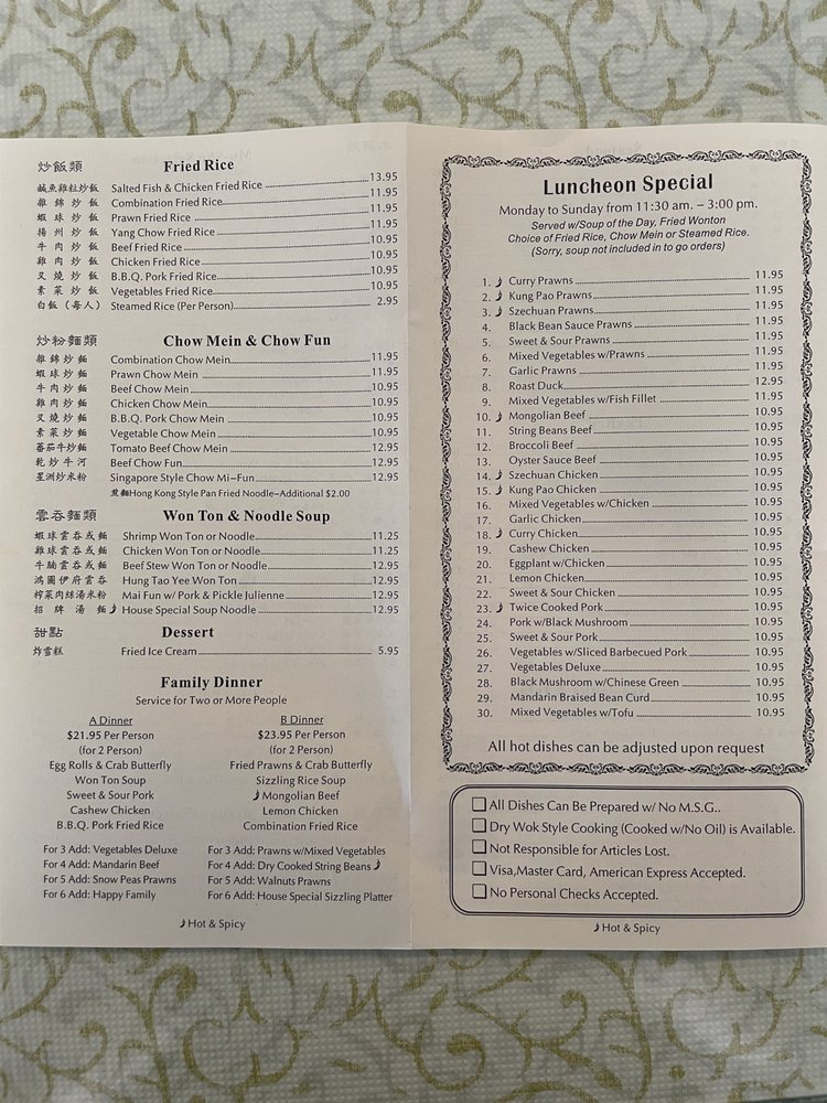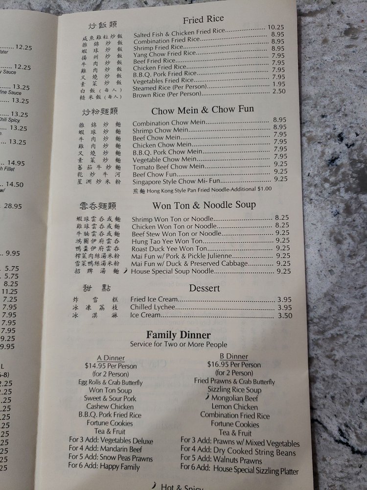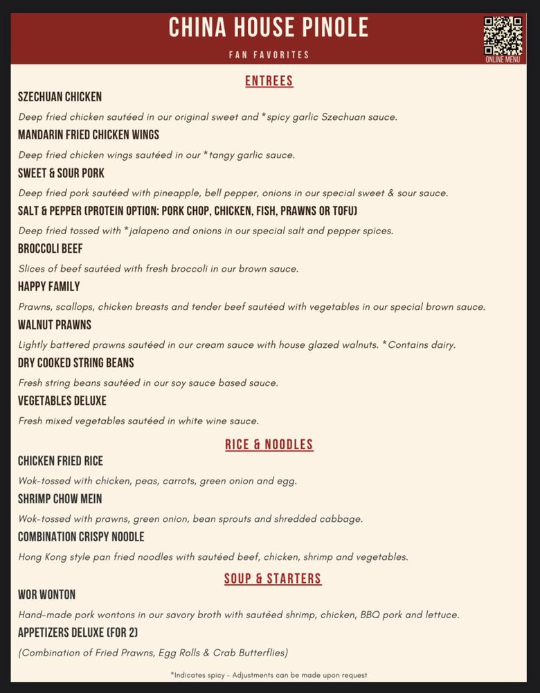 China House, located in Pinole, CA, is a casual Chinese restaurant that offers a variety of dishes and services. With options for vegetarian and meat lovers alike, China House provides a diverse menu with dishes like Salt and Pepper Fish, Chicken Salted Fish, and Tofu Clay Pot. Customers have praised the friendly waitstaff and efficient service, although some have noted a decrease in portion sizes and an increase in prices over the years. The ambiance is described as homey and family-oriented, making it a favorite spot for locals in the East Bay area. Overall, China House is known for its flavorful dishes like Won Ton soup, fried rice, broccoli beef, and sweet and sour chicken, making it a must-visit destination for those craving delicious Chinese cuisine.